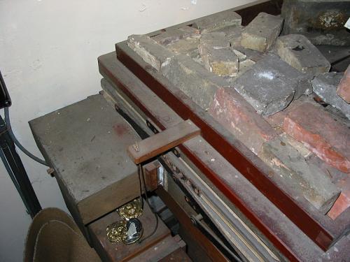 L'arrière de l'orgue est fermé par une caisse en bois posée sur pilotis surplombant le moteur et le soufflet.