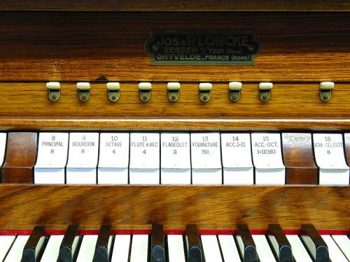 Au-dessus des claviers, registres à bascules en plastique avec, gravés en noir, la numérotation de 1 à 24, l'indication de PED., I et II et le nom du jeu.
