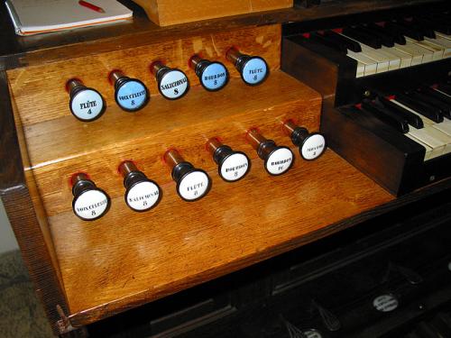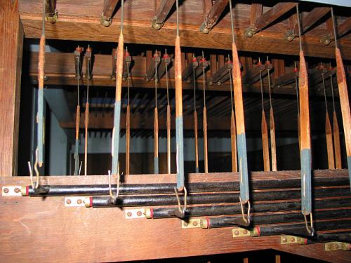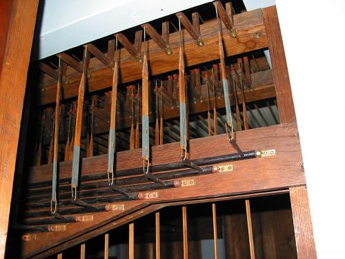 Les jeux du Petit Clavier et du Pédalier sont empruntés aux jeux du Grand Clavier par un système à doubles gravures. Il n'y a donc en tout que 12 jeux réels sur un seul sommier en deux parties.