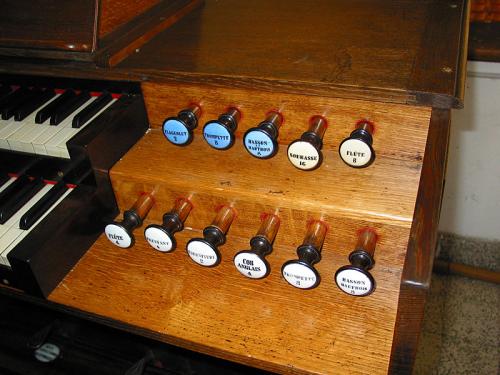 La première octave de ce jeu de réemploi ayant disparu, il a été posé en 4’, et la dernière octave a été complétée par des tuyaux à bouche.