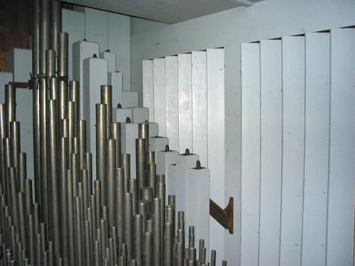 Tout l’orgue est enfermé dans une boîte expressive, dont les jalousies sont situées derrière les tuyaux de Montre.