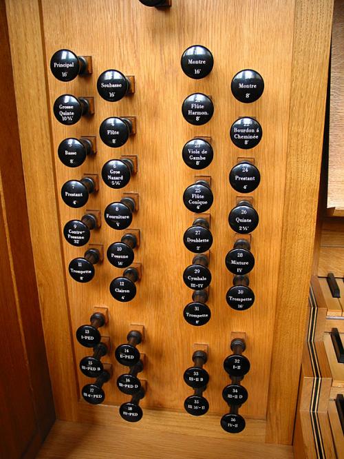 Grand-Orgue et Pédale à gauche, Solo et Récit expressif à droite.