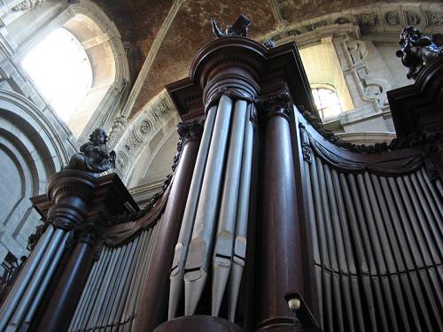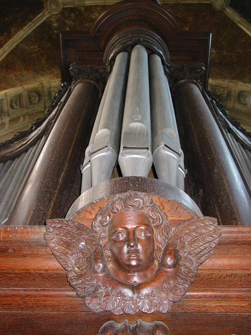 A signaler encore les lourds trophées d’instruments de musique aux ailerons, signes du baroque tardif.
