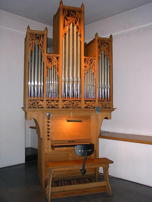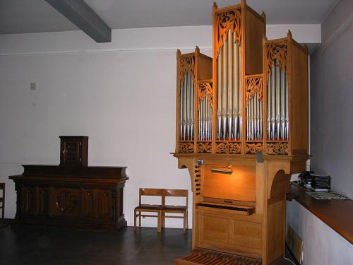 Construit sur le modèle de l’orgue de l’Alte Kirche de Northen (D). Meuble entièrement fermé avec encorbellement. Au pied des tuyaux, il y a des cartouches avec des motifs sculptés (êtres humains stylisés, feuillages) sur fond de toile de jute, motifs que l'on retrouve en claire-voie, au sommet des tuyaux de façade.
