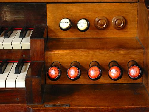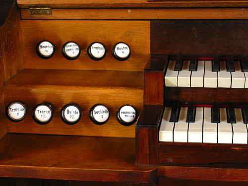Console - Description Fermée par un couvercle. Deux claviers, tirants de registres de part et d’autre sur deux niveaux : à gauche, registres du Grand-Orgue ; à droite, en haut, registres de la Pédale, en bas, registres du Récit.