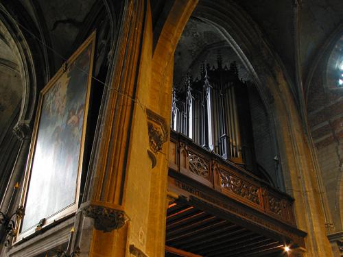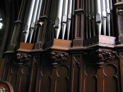 Seconde console. Intérieur en chêne laqué avec simple clavier surmonté d’une rangée horizontale de dominos à bascule pour les registres du Positif.