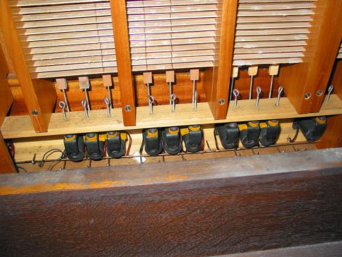 Sous le clavier du Grand-Orgue des trois pistons blancs et trois de couleur (noir, rouge et vert) au-dessus desquels est collée une plaquette de verre coloré sur laquelle est inscrit : "Registration manuelle (manquante), Comb. libre I, Comb. libre II, Annulateur, Comb. fixe 1, Comb. fixe 2, Comb. fixe 3, Comb. fixe 4, Comb. fixe 5" (décollé).