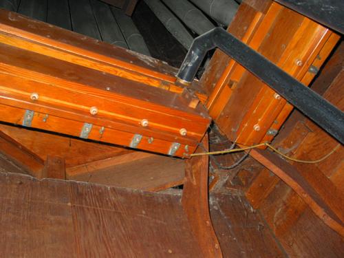 A droite, il y a un gros interrupteur noir pour le moteur de l'orgue, un bouton métallique avec une étiquette: "Si la dynamo excite trop lentement pousser sur le bouton (normal 12 v.)", un interrupteur (marche / arrêt) ajouté avec témoin lumineux et un téléphone intérieur.