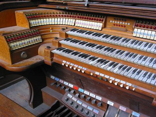 Il y a une file horizontale de dominos passant au-dessus des claviers et qui est interrompue au centre par les témoins lumineux des boîtes expressives et du crescendo général.