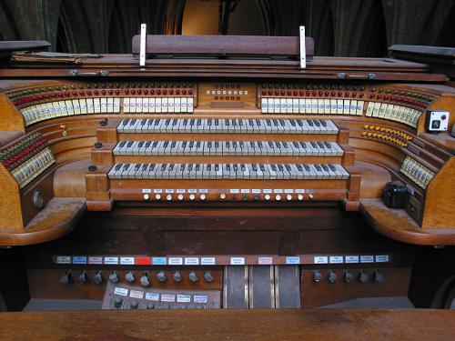 Seconde console. Intérieur en chêne laqué avec simple clavier surmonté d’une rangée horizontale de dominos à bascule pour les registres du Positif.