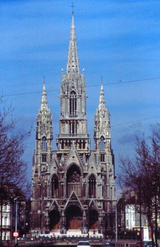 L’église Notre-Dame de Laeken, de plan longitudinal, présente en façade l’organisation traditionnelle des sanctuaires gothiques. Elle s’ouvre par trois portails ogivaux précédés par des avant-portails couronnés de gâbles. Une rosace centrale et des fenêtres hautes latérales les surmontent, précédées de tribunes également couronnées de gâbles. Au centre se dresse la tour principale formée de deux niveaux de galeries cernées de colonnes et d’un étage orné d’ouvertures ogivales géminées et sommées d’une flèche ajourée.