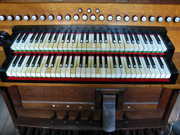 Le clavier tire son nom du mot latin claves. Clavier manuel ou à pieds, c’est lui que l’organiste « touche » ou sur lequel il « joue ». Le clavier est divisé en octaves, chacune comprenant 7 touches diatoniques et 5 touches faisant sonner les notes dièse ou les notes bémol, le tout donnant 12 demi-tons. Sur certains orgues anciens ou à l’ancienne, il peut y avoir des doubles touches pour le dièse et le bémol de certains tons, comme mib et ré# ou lab et sol#, afin d’en différencier la hauteur. Le clavier standard actuel comporte 56 notes et 30 pour la Pédale. Auparavant, il pouvait y en avoir 54 ou moins, selon l’absence de notes dans l’aigu et de certaines notes dans le grave, à commencer par le 1er do#.