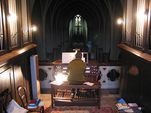 Beschrijving van de orgelkast Deze orgelkas in neogotische stijl telt 2 delen aan weerszijden van het westelijke vensterwerk. Het is gebouwd in massief donker eik, en georganiseerd in velden. Celles qui font face au centre de la tribune on la particularité d'être constituées d'un cadre comportant les tuyaux, cadre qui est fixé sur des charnière et s'ouvre comme de grandes portes vers l'intérieur de l'orgue, notamment, pour accorder les anches.