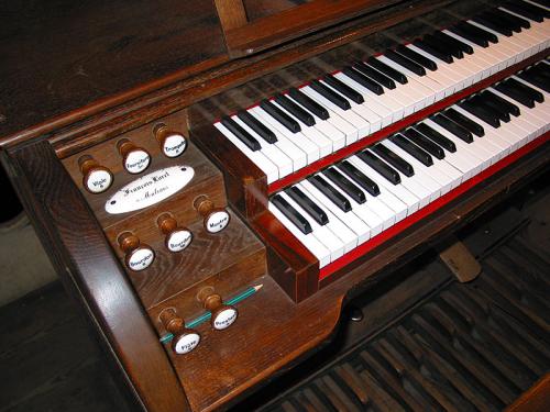 Speeltafel - beschrijving Vrijstaande speeltafel, opgesteld in het midden van de galerij, tussen de twee orgelkassen. Panneaux escamotables sur les quatre faces (de même type qu'au Loret du Couvent Saint-Antoine). Couvercle à lames de chêne coulissant en arrondi. Décoration néogothique dans les panneaux.