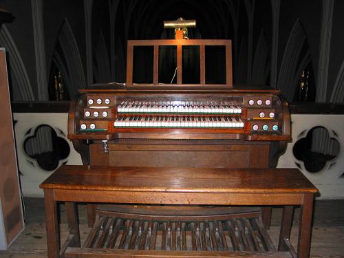 Speeltafel - beschrijving Vrijstaande speeltafel, opgesteld in het midden van de galerij, tussen de twee orgelkassen. Panneaux escamotables sur les quatre faces (de même type qu'au Loret du Couvent Saint-Antoine). Couvercle à lames de chêne coulissant en arrondi. Décoration néogothique dans les panneaux.