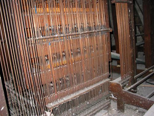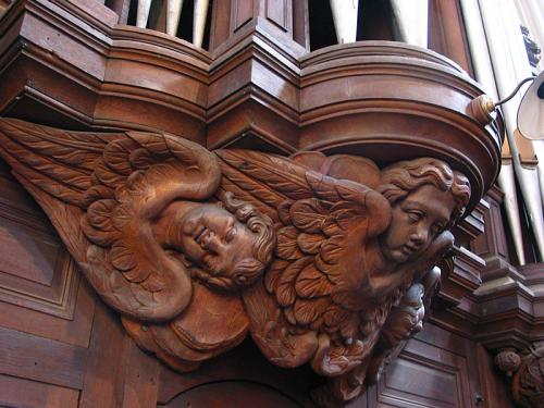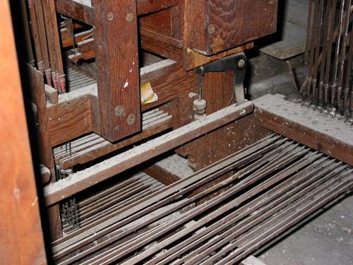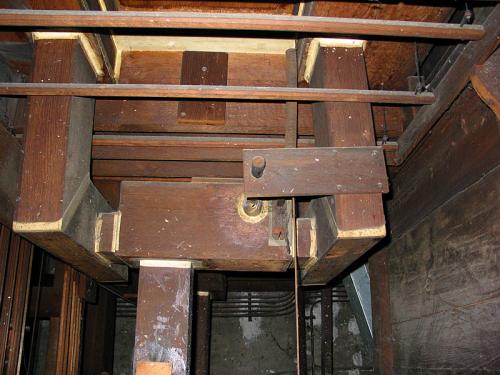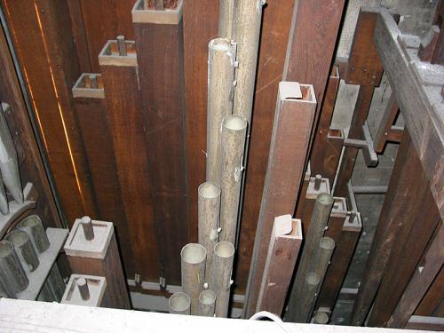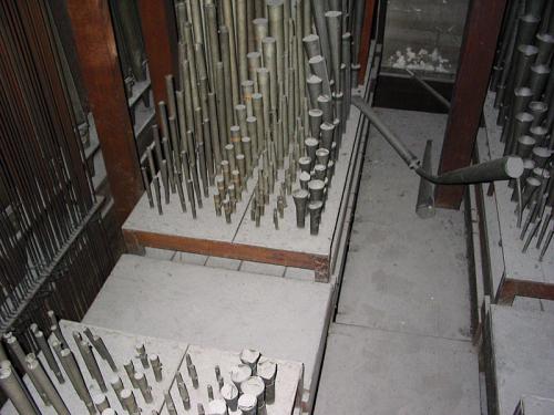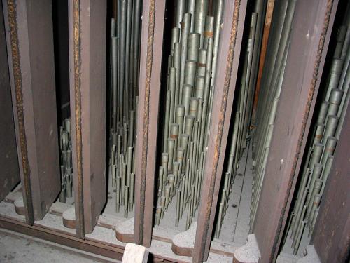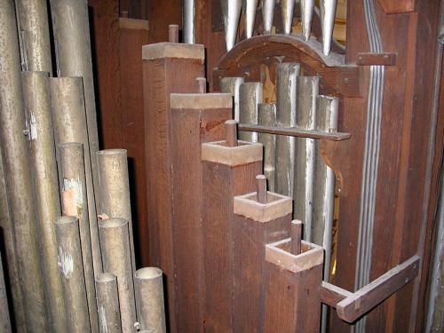 MONTRE 8’. pijpen met kernsteken en inscripties aan de voet en aan de voetspits. 10 pijpen in de buitentorens van het front. 2 zinken pijpen met kastbaarden, rolbaarden (metalen baar).