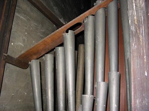 VOIX CELESTE 8’. 44 conische pijpen tot c met kernsteken en insnijding waarvan 7 pijpen in zink met kastbaarden, 11 tinnen pijpen met kastbaarden, 19 tinnen pijpen met zijbaarden en 7 tinnen pijpen.