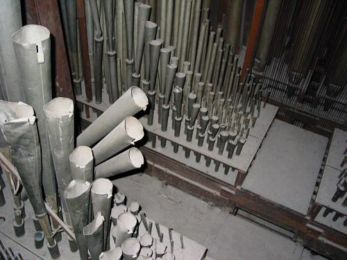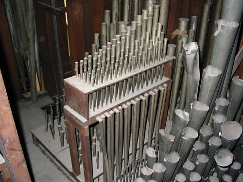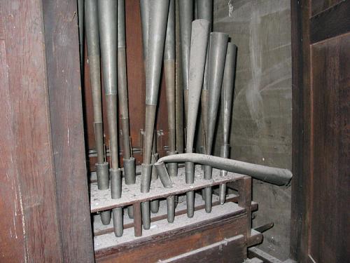 CLAIRON 4’. 42 pijpen met tinnen bekers, snavelkelen en Franse stemkruk waarvan 9 pijpen met ijzeren binnenschoen en Franse kop met ring, 15 pijpen zonder ijzeren binnenschoen en 18 pijpen zonder ring. Blijft 14 open pijpen in tin met kernsteek en snijbaarden waarvan er 2 gebroken zijn.