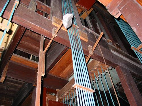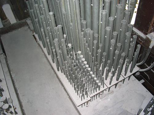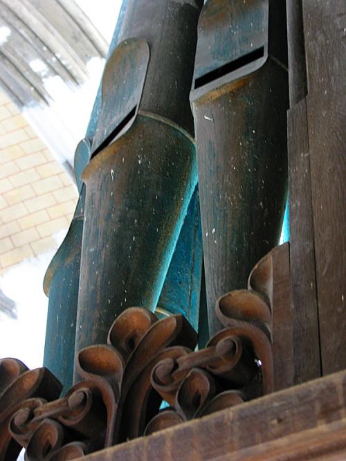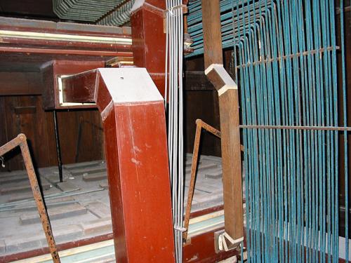 Voor de drie (ontdubbelde) tongwerkregisters zijn de punten in koper, de kernen vierkant, de mondstukken cirkelvormig en de stemkrukken van ijzer.