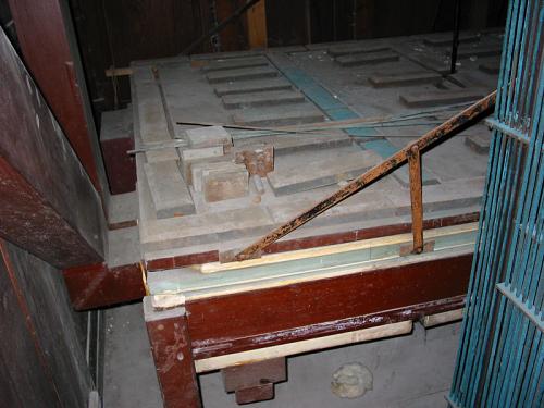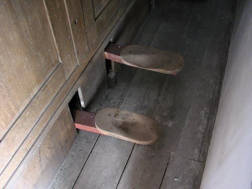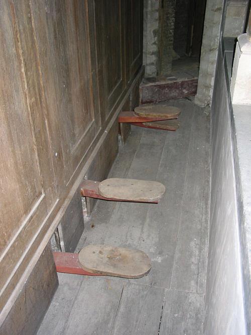 VIOLA DA GAMBA 8'. 12 open pijpen in zink met rollers (do1 tot si1). 44 open pijpen in tin (do2 tot sol5) met snijbaarden tot do#4, daarna zonder. Inscriptie op do2 : Viole de gambe c.