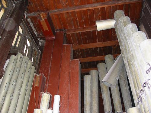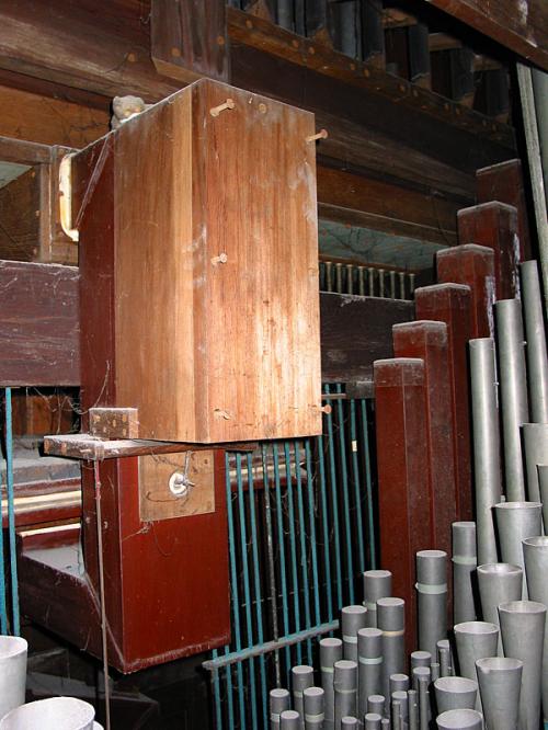 NACHTHOORN 8'. 12 open pijpen in geschilderd grenen, vervoerd, op de zijkanten, aan de achterzijde van de windlade. 44 gedekte pijpen in tin, met mobiele hoeden, op de windlade.