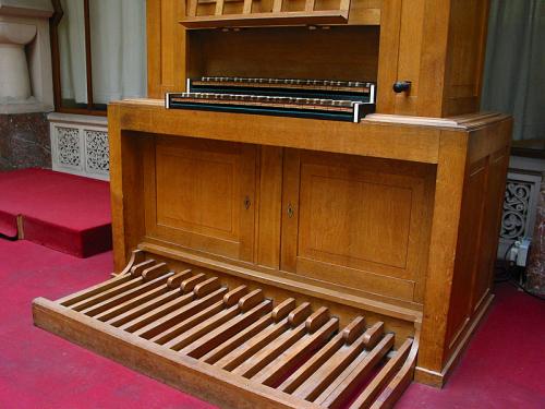 Opstelling van de pijpen Twee luiken beschermen de verdieping die voorbehouden is aan het pijpwerk