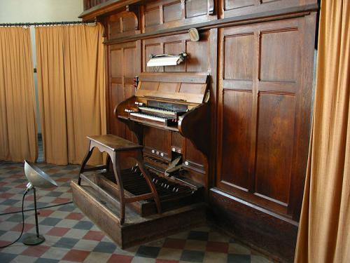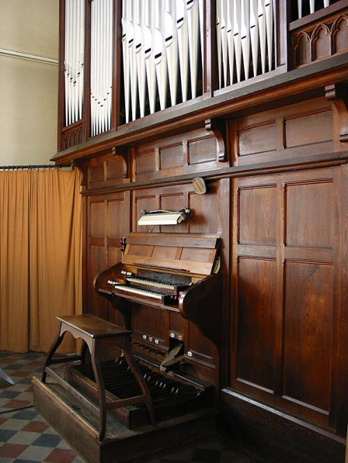 Speeltafel - bijzonderheden Ronde registertrekkers, bediening aan de voeten: koppelingen, pedaalkoppels met lepels; twee zwelkasten