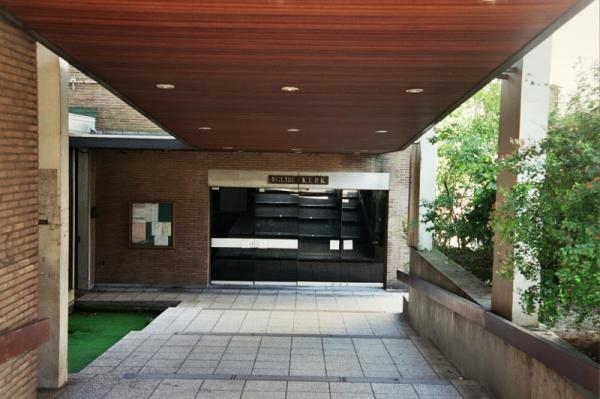 Op de benedenverdieping, rechts van het gebouw, bevindt zich een eerste aanduiding van de kerk, nl. een minuscuul kruis naast het hellend vlak dat naar een ruim beglaasde dubbele deur voert via dewelke de eredienstruimten kunnen worden betreden.